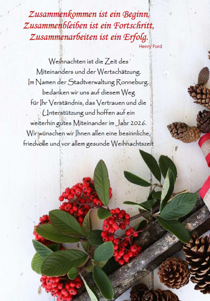 Gleichzeitig richten wir den Blick nach vorn. Für das kommende Jahr stehen wichtige Aufgaben auf unserer Liste, die wir entschlossen anpacken werden. Wir wollen bewährte Wege fortsetzen und Neues mutig angehen – sei es bei der weiteren Verbesserung der Infrastruktur, dem Erhalt unserer Natur und unseres kulturellen Lebens. Ich bin überzeugt: Mit dem Engagement und dem Gemeinschaftsgeist, der unsere Stadt auszeichnet, können wir optimistisch in die Zukunft schauen.