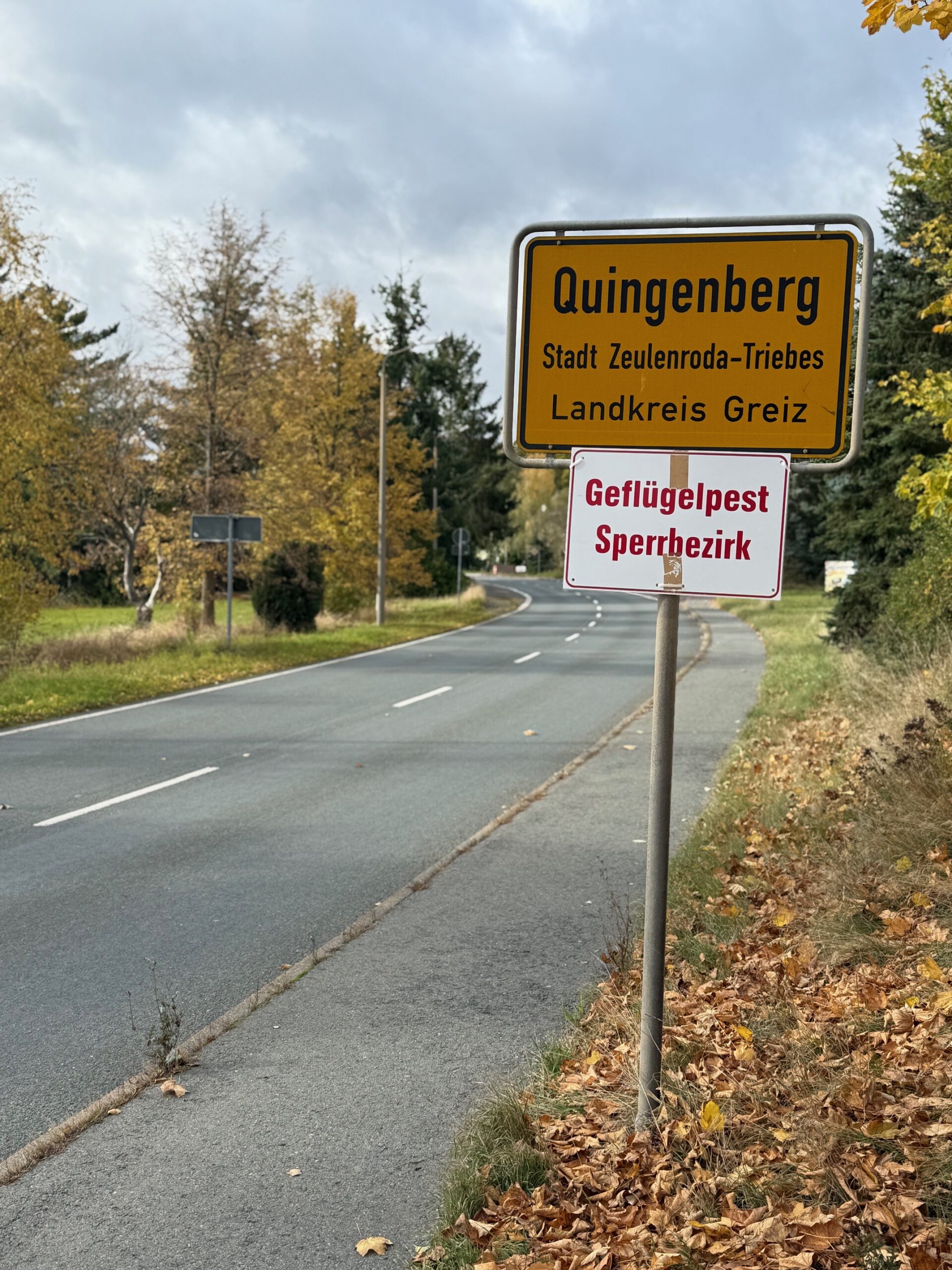 Bildunterschrift: Die Hinweisschilder auf das Geflügelpest-Ausbruchsgebiet – wie hier im Zeulenroda-Triebeser Ortsteil Quingenberg – werden ab morgen nach und nach wieder entfernt.