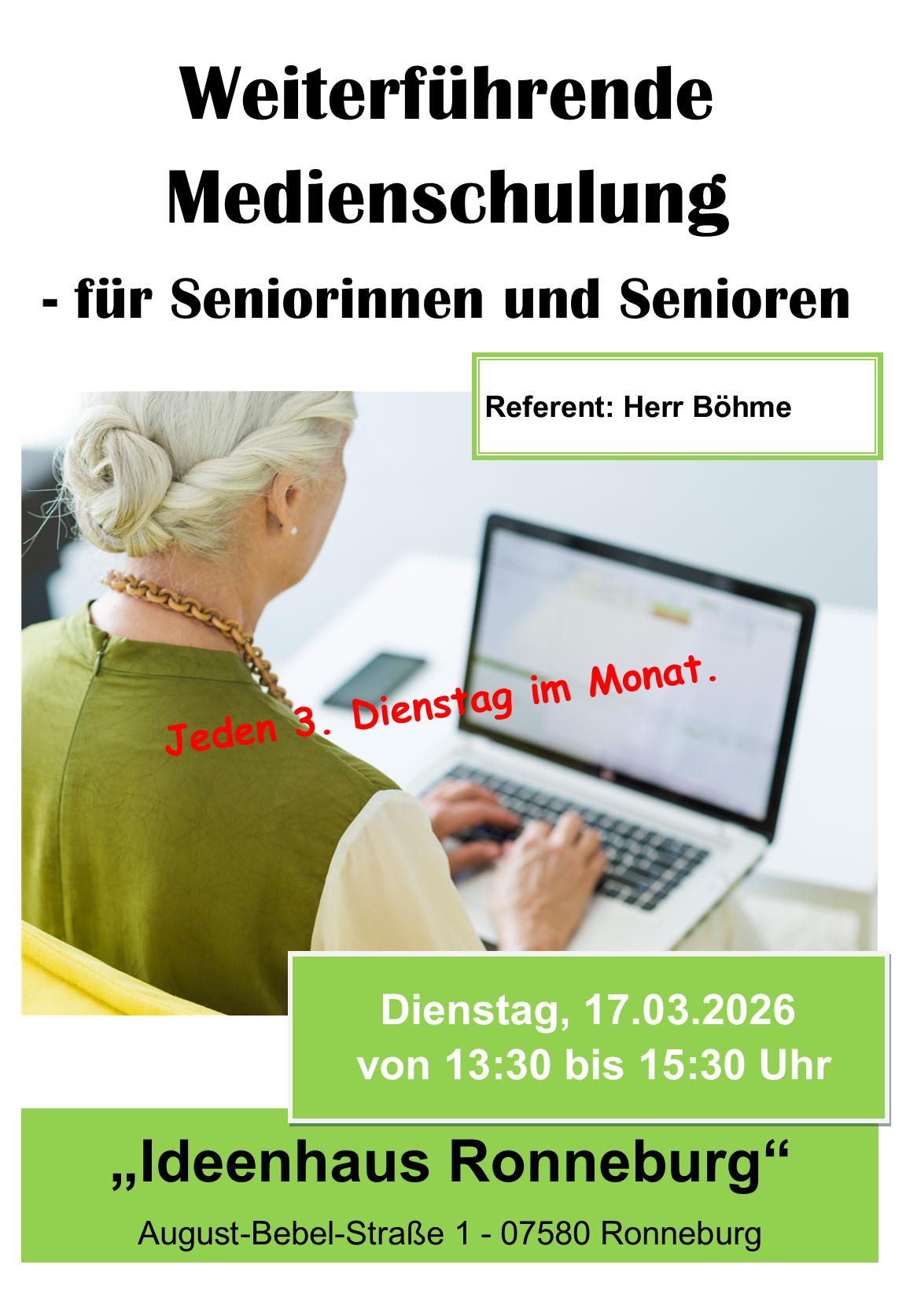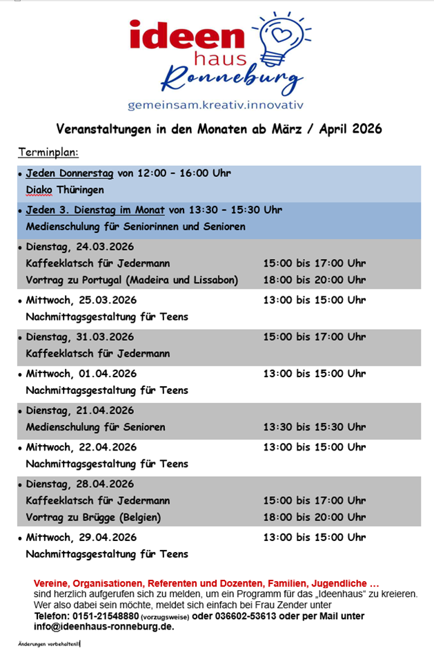 Wer also dabei sein möchte, meldet sich bei Frau Zender unter Telefon: 036602-53613, 0151-21548880 oder per Mail unter info@ideenhaus-ronneburg.de.