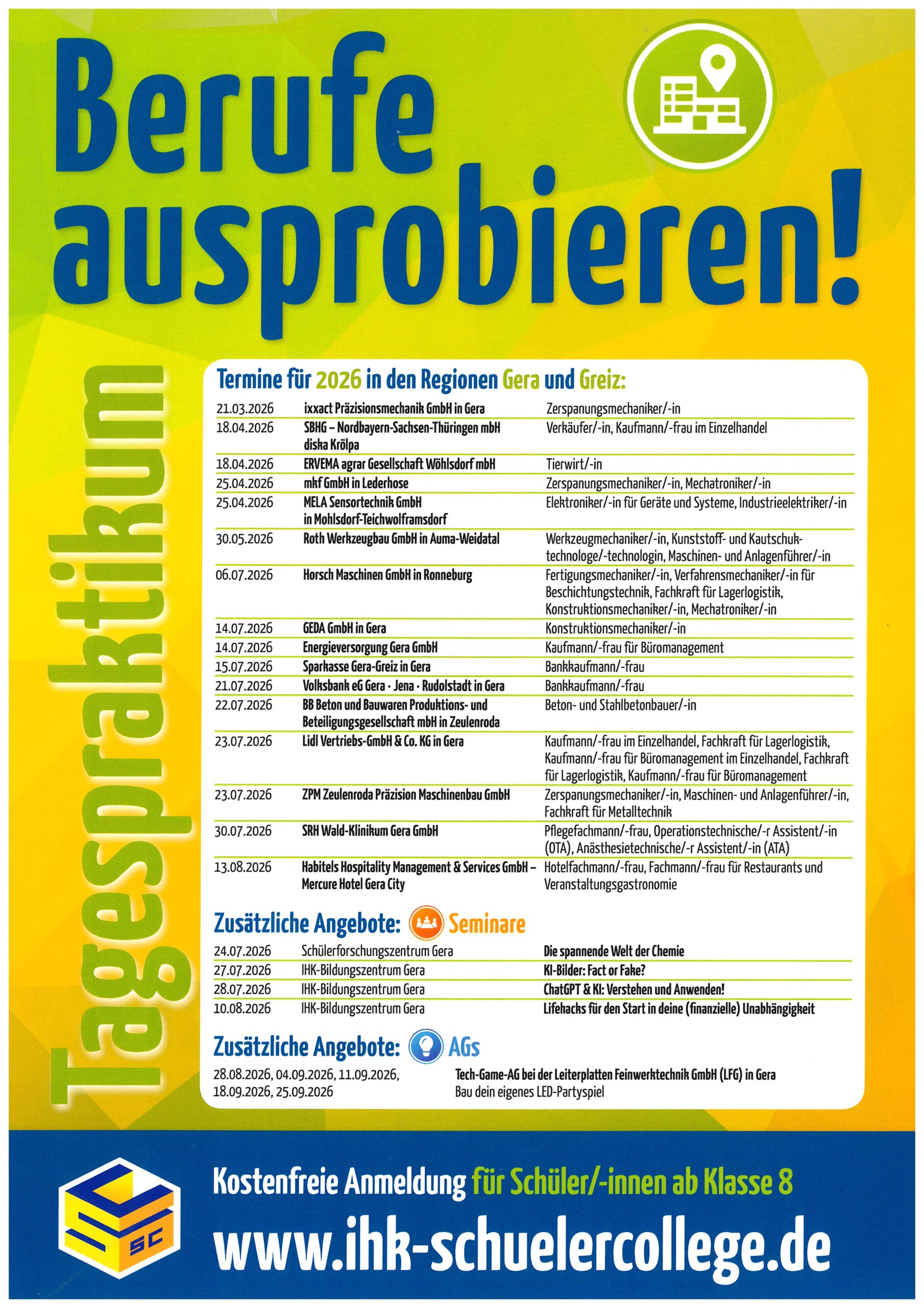 Ziel ist es möglichst viele Jugendliche und Eltern zu erreichen. Nutzen Sie die Website www.ihk-schuelercollege.de/programmheft zur Information oder zur Anmeldung von Tagespraktika.