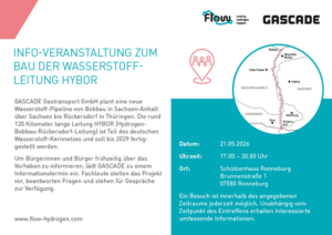 GASCADE Gastransport GmbH (GASCADE) plant eine neue Wasserstoff-Pipeline, die über etwa 120 km von Bobbau in Sachsen-Anhalt bis Rückersdorf in Thüringen verläuft. Die Pipeline HYBOR (Kurzform für Hydrogen-Bobbau-Rückersdorf-Leitung) ist Teil des deutschen Wasserstoff-Kernnetzes und soll bis 2029 fertiggestellt werden. HYBOR wird von GASCADE als Teil des Infrastruktur-Programms „Flow – making hydrogen happen“ umgesetzt, mit dem der Aufbau einer leistungsfähigen Wasserstoff-Versorgung in Deutschland vorangetrieben wird.