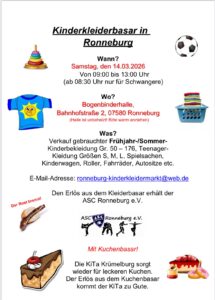 12. Februar 2026Aktuelles, News, RonneburgTina Zender Am Samstag, den 14.03.2026 von 09:00 bis 13:00 Uhr und für Schwangere ab 08:30 Uhr findet der Kinderkleiderbasar in der Bogenbinderhalle Ronneburg statt.