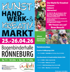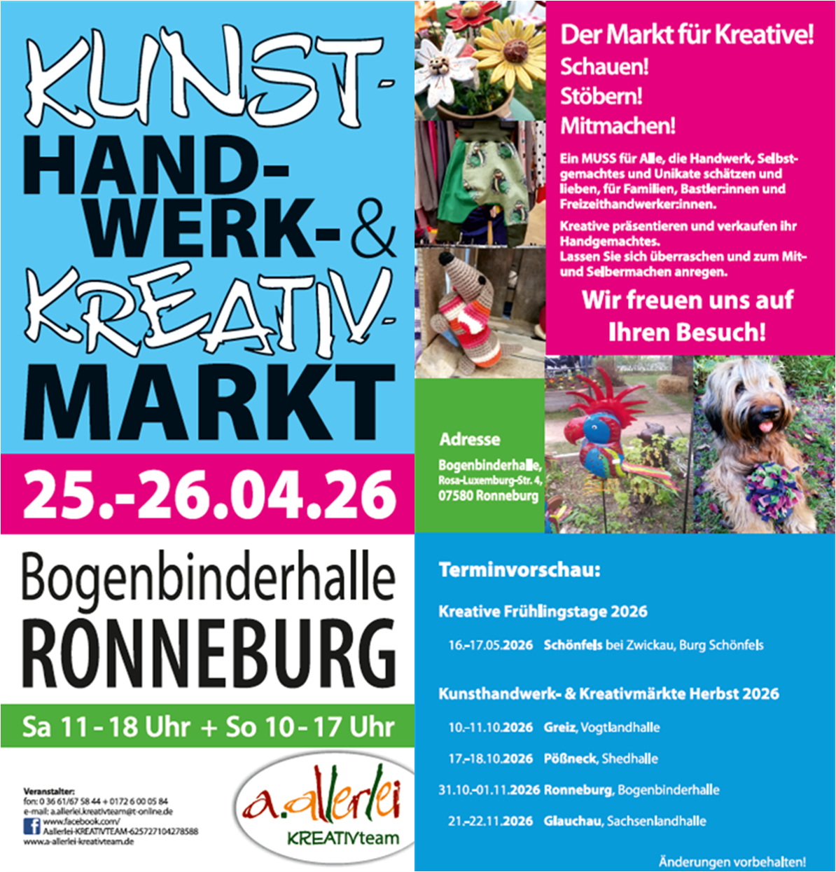 | 25.04.2026 / 26.04.2026 Kunsthandwerk- und Kreativmarkt in der Bogenbinderhalle Ronneburg Pressemitteilung Kunsthandwerk- und Kreativmarkt Ronneburg |