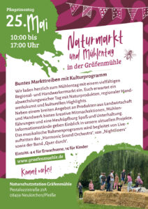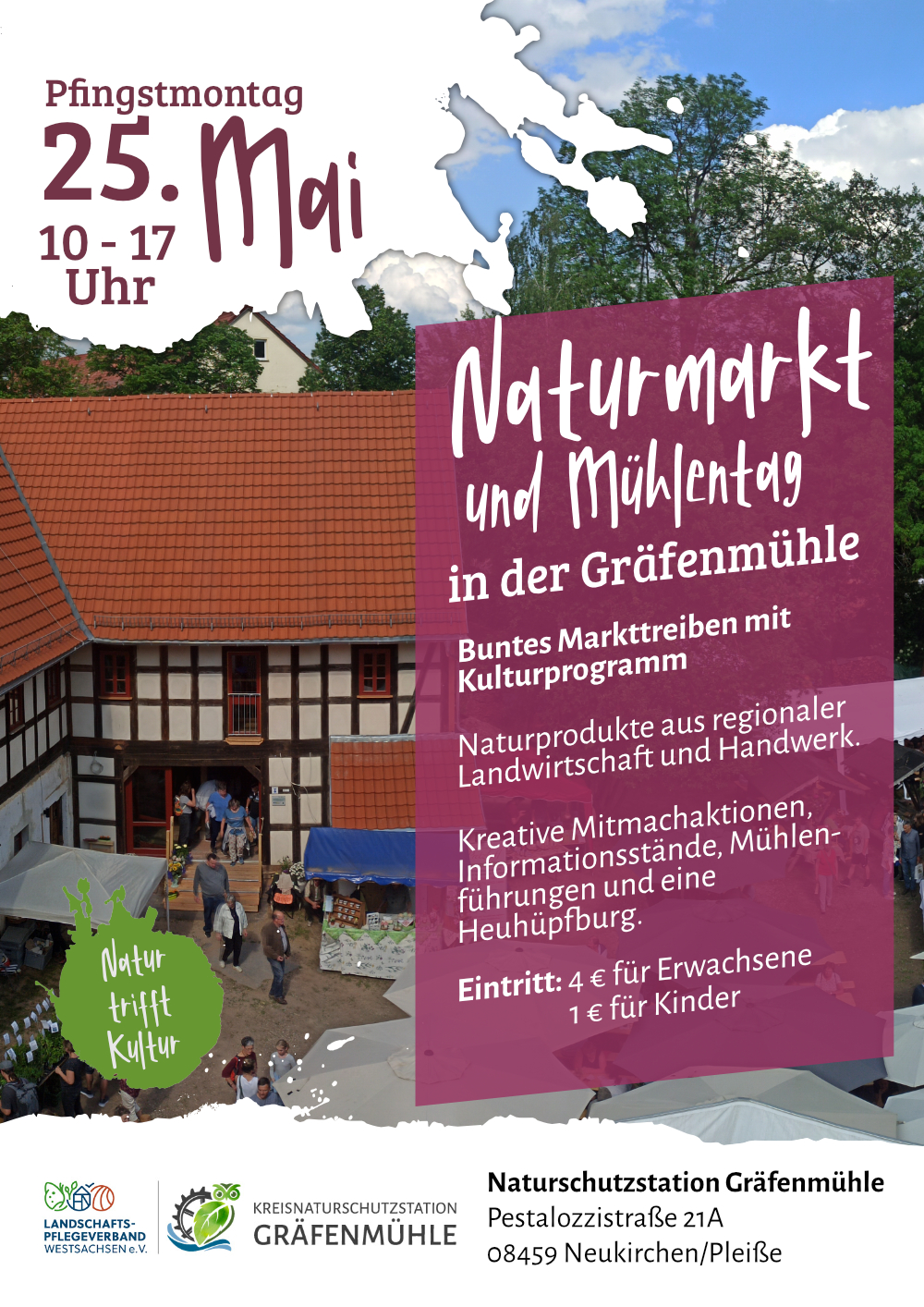 | 25.05.2026 Mühlentag mit Regional- und Handwerkermarkt in der Gräfenmühle, Neukirchen/Pleiße Mühlentag mit Regional- und Handwerkermarkt in der Gräfenmühle, Neukirchen/Pleiße Am Pfingstmontag, den 25. Mai, lädt der Landschaftspflegeverband Westsachsen e. V. herzlich zum Mühlentag mit einem vielfältigen Regional- und Handwerkermarkt in die Gräfenmühle nach Neukirchen/Pleiße ein. Besucherinnen und Besucher erwartet ein abwechslungsreicher Tag, an dem Naturprodukte, regionale Handwerkskunst und kulturelle Highlights auf einzigartige Weise miteinander verschmelzen. Neben einem breiten Angebot an Produkten aus Landwirtschaft und Handwerk der Region bieten kreative Mitmachaktionen, Mühlenführungen und eine Heuhüpfburg Spaß und Unterhaltung für Groß und Klein. Informationsstände geben Einblick in aktuelle Naturschutzprojekte und laden zum Austausch ein. Das bunte Rahmenprogramm wird musikalisch begleitet vom „Harmonic Sound Orchestra“, das jedes Jahr mit seinen Liveauftritten begeistert – der kleinsten, aber lautesten Akkordeon BigBand der Welt – sowie von „Nightliners“ mit musikalischen Geschichten für große und kleine Träumer und der Band „Quer durch“ mit Folkmusik aus aller Welt. Freuen Sie sich auf einen erlebnisreichen Tag in der einzigartigen Kulisse der Gräfenmühle – hier verschmelzen Natur, Kultur und Handwerk zu einem besonderen Erlebnis. Wann: Pfingstmontag, 25. Mai 2025, 10:00 Uhr – 17:00 Uhr Eintritt: Infos: www.graefenmuehle.de Naturschutz-, Bildungs- und Kulturzentrum Gräfenmühle |