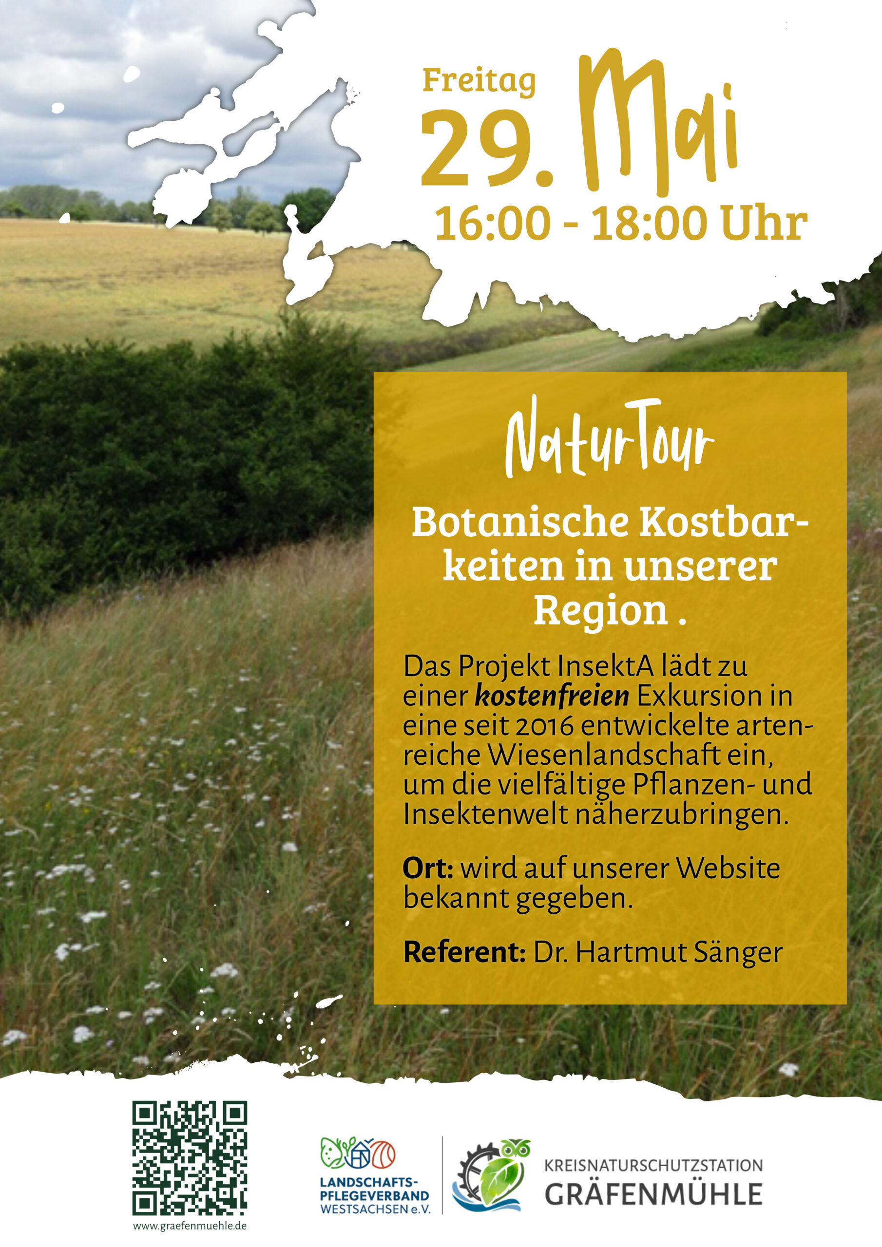 | 29.05.2026 NaturTour Botanische Kostbarkeiten in unserer Region ![]() Wir laden Sie ein, gemeinsam mit dem Biologen Dr. Hartmut Sänger eine ökologische Kostbarkeit nördlich von Langenreinsdorf zu erkunden. Dabei handelt es sich um einen spannenden Standort, welcher seit 2016 zu einer artenreichen Wiesenlandschaft entwickelt wird. Die Exkursion wird interessierten Bürger:innen und Landwirt:innen einen Einblick in die besondere Pflanzen- und Insektenwelt im Gebiet geben. Organisiert wird die Exkursion durch das Projekt InsektA, das sich für die Förderung eines breiten Spektrums von Insektenarten im Agrar- als auch Siedlungsraum einsetzt.Die Veranstaltung richtet sich besonders an Neugierige ohne Vorkenntnisse. Wer Lust hat, die Natur mit offenen Augen neu zu entdecken, ist herzlich eingeladen.Die Veranstaltung ist kostenfrei.Wann: Freitag, 29.Mai.2026, 16:00 bis 18:00 Uhr Wo: nördlich von Langenreinsdorf, 08451, genauer Treffpunkt wird noch bekanntgegeben Referent: Dr. Hartmut Sänger, Daniel Schmidt Anmeldung: info@lpv-westsachsen.de, 03762 75935 0 Foto/Autor: 05_07_2020_/Dr. Hartmut Sänger |