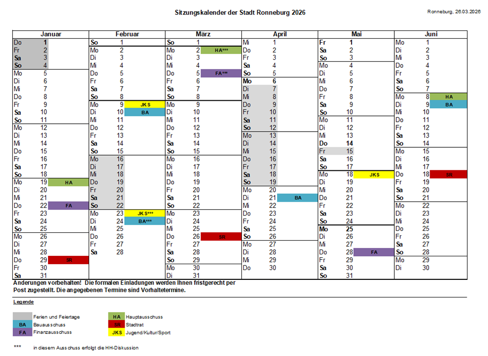 Der Sitzungskalender dient zur Orientierung der Sitzungstermine.